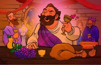 One-act-play: The parable is presented as a one act play with two scenes. The opening scene presents the luxurious life of the rich man in costly dress, enjoying five course meals every day, in contrast to the miserable life of the poor, sick beggar living in the street by the rich man’s front door, competing with stray dogs for the crumbs discarded from the rich man’s dining table. The name ‘Lazarus’ means ‘God is my help.’ Despite a life of misfortune and suffering, Lazarus does not lose hope in God. As the curtain goes up for the second scene, the situation is reversed. The beggar Lazarus is enjoying Heavenly bliss as a reward for his fidelity to God in his poverty and suffering, while the rich man is thrown down into the excruciating suffering of Hell as punishment for not doing his duty of showing mercy to the poor, sharing with the beggar at his door the mercies and blessings God has given him.